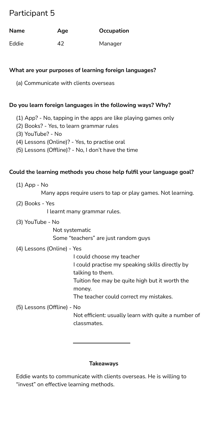 I have interviewed 5 people to discover their purposes and methods of language learning, as well as the frustrations they are facing.